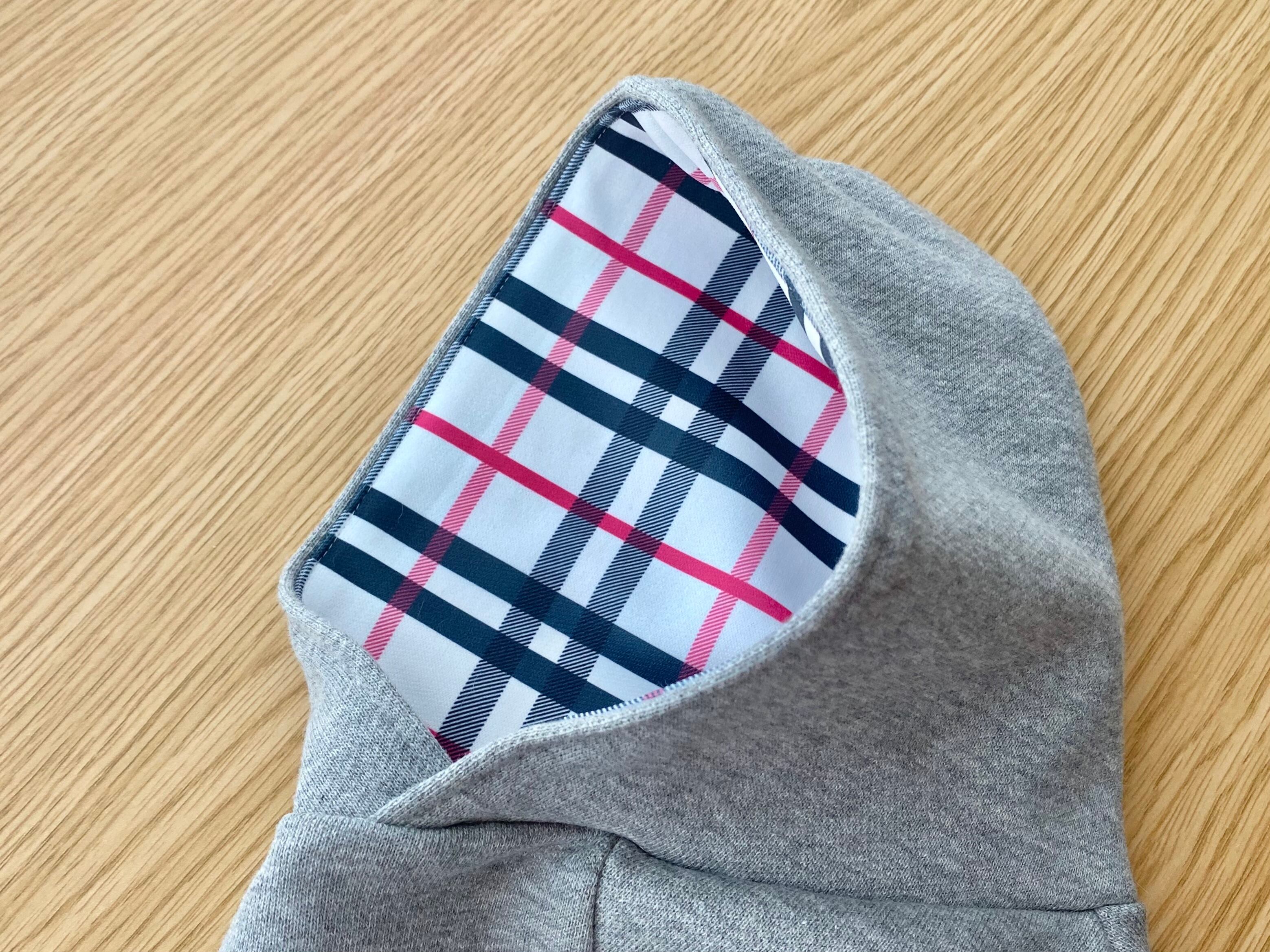 フード部分を折り曲げることによってチェック柄の襟のようにすることも可能です。
